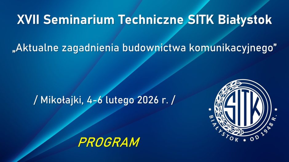 Zarząd Oddziału SITK Białystok organizuje w dniach 4-6 lutego 2026 r. w Mikołajkach XVII edycję Seminarium Technicznego SITK pt. „Aktualne zagadnienia budownictwa komunikacyjnego”. Szczegóły znajdują się poniżej.